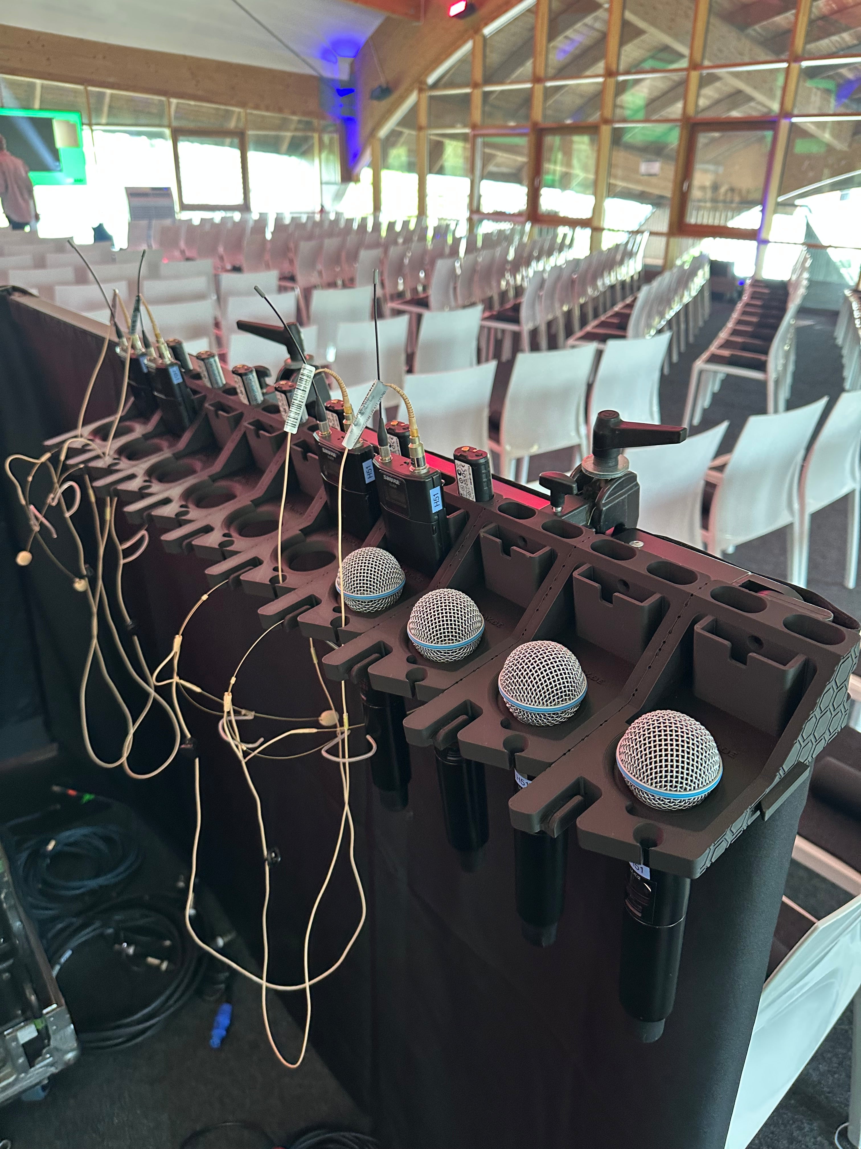 Micbay ist ein modulares Aufbewahrungssystem für kabellose Mikrofone, Handmikrofone, Beltpacks, Headsets, Lavaliermikrofone und Akkus. Das System eignet sich für jeden Technikplatz/ Regie/ Messestand oder Backstage an der Bühne. Es lässt sich modular erweitern und auf eine beliebige Anzahl Mikrofone anpassen. Durch sein simples Verriegelungssystem lässt es sich schnell und intuitiv erweitern oder umbauen.